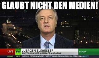 Jürgen Elsässer (geb. 1957) ist ein deutscher ehemaliger Lehrer, freier Journalist und Buchautor, der aktuell dem populistischen und rechtsoffenen Querfront-Spektrum zuzuordnen ist. Die deutsche Wochenzeitschrift Der Spiegel bezeichnet Elsässer als "Rechtspopulist[en] und Verschwörungstheoretiker" und nennt als Kooperationspartner in Frankreich ein Institut für Demokratie und Zusammenarbeit, einen so genannten "think tank", der laut eigener Aussage von russischen Privatleuten gesponsert wird und als "kremlnah" gilt.[1] Der aus Stuttgart stammende Truther und AfD-Unterstützer Elsässer behauptet, seine Lehrerlaufbahn "an den Nagel gehängt" zu haben, um "die Wahrheit zu schreiben".