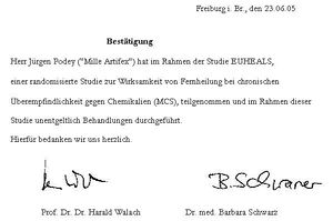 2005 nahm Podey an der EUHEALS-Studie von Harald Walach und Harald Wiesendanger teil, die bezweckte, Fähigkeiten von Geistheilern zu testen. Von dieser Studie wurde er jedoch später ausgeschlossen,[5] weil er sich als Medizinlaie und ohne jegliche medizinische Qualifikation als "staatlich geprüfter Heiler" bezeichnete.[6] Podey wirbt jedoch nach wie vor mit einem Brief von Walach von der Universität Freiburg, in dem dieser Podey dafür dankt, dass er im Rahmen der Studie "unentgeltlich Behandlungen durchgeführt" habe (siehe Bild rechts).[7] Dieses Schriftstück ist für Podey "schwarz auf weiß der wissenschaftlich fundierte Nachweis zur Wirkung der Homöopathie."