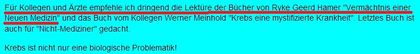 ..Für Kollegen und Ärzte empfehle ich dringend die Lektüre der Bücher von Ryke Geerd Hamer "Vermächtnis einer Neuen Medizin" und das Buch vom Kollegen Werner Meinhold "Krebs eine mystifizierte Krankheit". Letztes Buch ist auch für "Nicht-Mediziner" gedacht..[3]