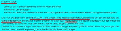 2. Zitat: ..Ein Schwerpunkt dabei ist die Frühdiagnostik. Seit Ende 2005 waren wir mit dem ETAScan-Gerät ausgestattet, und somit Vorreiter in die Welt der naturheilkundlichen Diagnostik. Auch wenn diese Art der Magnetresonanz-Diagnostik, die eine bisher unbekannte Exaktheit und Tiefe der Diagnose ermöglicht, wird von der etablierten Medizin bis heute weder verstanden noch anerkannt. In Länder des ehemaligen sog. "Ost-Blocks" wird sie hingegen bereits als Beweismittel vor Gericht zugelassen. Diese Methode ist für den Patienten berührungs- und auch belastungsfrei. Es gibt keine schädlichen Strahlen und auch kein Kontrastmittel. Meine damalige Prognose, daß diese Geräte sich kurzfristig weiter entwickeln würden, ist übertroffen worden. Wir benutzen heute zusätzlich zum METAscan das CyberTrone-System, das noch wesentlich mehr Diagnostik-Felder eröffnet. Ich prognostiziere, daß diese Geräte innerhalb der nächsten Jahre alle Röntgen-Geräte inklusiv MRT und CT ins Museum verbannen werden. Mit ihnen bieten wir sowohl vorsorgliche Diagnostik als auch Verlaufs-Diagnostik und Verlaufskontrolle bei schweren Erkrankungen... [1]