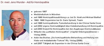• Aus der Mischrift eines Wurster-Seminars, für das Ärzte in Deutschland 16 Fortbildungspunkte erwerben konnten (Seminar Dr. Jens Wurster, 22.-23. Februar 2008, "Praktische Krebsbehandlung mit Homöopathie" in München-Pullach): "Fallbeispiel: Tumor in der Brust: 37j Patientin entdeckt einen 1cm grossen harten Knoten in der Brust. Vor einem Jahr Fahrradunfall mit Stoss an der li. Brust