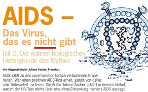 - ↑ SACHER, Juliane: AIDS-Forschung in der Sackgasse. Hemmt das HIV/AIDS-Dogma heilberufliche Hilfe? in CoMed 11, 1999, S. 80 ff