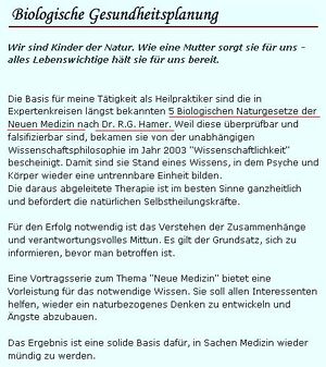 - Die Basis für meine Tätigkeit als Heilpraktiker sind die in Expertenkreisen längst bekannten 5 Biologischen Naturgesetze der Neuen Medizin nach Dr. R.G. Hamer. Weil diese überprüfbar und falsifizierbar sind, bekamen sie von der unabhängigen Wissenschaftsphilosophie im Jahr 2003 "Wissenschaftlichkeit" bescheinigt. Damit sind sie Stand eines Wissens, in dem Psyche und Körper wieder eine untrennbare Einheit bilden.[1]