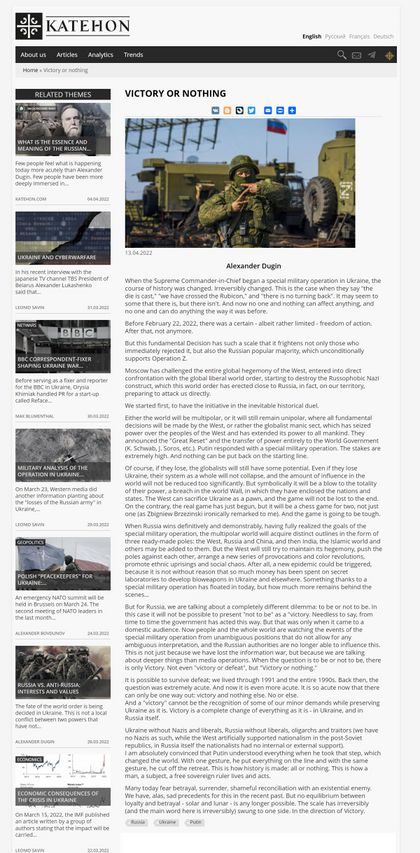 6. Victory or Nothing, Artikel von Alexander Dugin, veröffentlicht am 13. April 2022 auf katehon.com, Memento vom 23. April 2022 im Internet-Archiv.