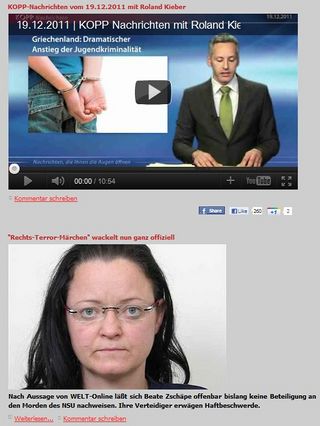 Kopp-Nachrichten auf Webseiten eines "Fränkischen Heimatschutz". Auf gleicher Seite mit Behauptungen zur rechtsterroristischen NSU (Screenshot vom 19. Dezember 2011)