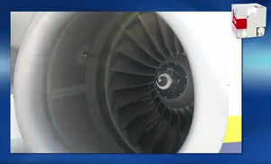 von Kopp gezeigtes Foto eines Ryanair-Triebwerks, das eine angebliche Chemtrail-Sprüheinrichtung zeigen soll. Zu sehen ist das bei Airbus und Boeing verbreitete Triebwerk CFM56 der Firma CFM International mit einem "fan inlet temperature sensor[31]