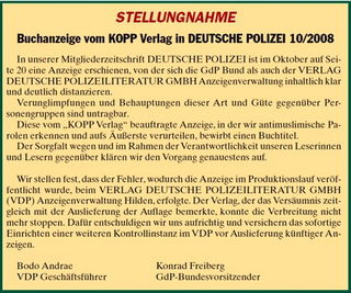 Eine Werbeanzeige im Jahr 2008 für ein Buch von Udo Ulfkotte in der Zeitschrift "Deutsche Polizei" sorgte für Proteste der Gewerkschaft der Polizei GdP (siehe Bild rechts). Der Kopp Verlag hatte zur Vermarktung dieses einen Buchs sogar eine eigene Domain im Internet eingerichtet.