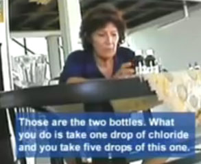 "MMS ist nicht zur Behandlung von Krankheiten, sondern lediglich zur Desinfektion von Trinkwasser und Lebensmittel zugelassen. Entscheidet man sich aber dennoch, MMS einzunehmen, beginnt man grundsätzlich mit nur ein bis zwei Tropfen MMS, am besten abends vor dem zu Bett gehen. Am besten nimmt man MMS 5–10 Minuten vor den Mahlzeiten, oder ab 2 Stunden nach den Mahlzeiten ein [...] Man gibt MMS in ein sauberes Trinkglas, für jeden Tropfen MMS gibt man die gleiche Menge "Activator" (z.B. 10% Zitronensäure oder 9% Salzsäure) hinzu. Danach schwenkt man das Glas kurz und lässt die beiden Substanzen für 3 Minuten miteinander reagieren. Die Reaktionszeit soll 3 Minuten sein, eventuell Eieruhr stellen. Anschließend wird das Glas mit Wasser aufgefüllt und diese verdünnte Lösung zügig getrunken."[30]