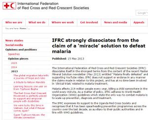 100. http://www.ifrc.org/en/news-and-media/opinions-and-positions/opinion-pieces/2013/ifrc-strongly-dissociates-from-the-claim-of-a-miracle-solution-to-defeat-malaria/