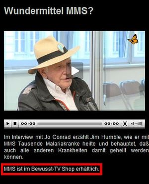 Miracle Mineral Supplement (MMS bzw. aktivierter Sauerstoff oder Vitamin O2, MMS1, CDS/Clorine dioxide solution, E 926. Auch Multieffect Mineral Solution, Maltesian Mineral Solution oder Master Mineral Solution) sind Handelsnamen des in Deutschland illegal angebotenen und nicht zugelassenen Arzneimittels[1][2][3][4], das etwa seit 2009-2010 in der Alternativmedizinszene als Nahrungsergänzungsmittel mit so genanntem aktiviertem Sauerstoff oder zur vermeintlichen "Wasserbehandlung" (bzw. als Advanced Oxygen Therapy) angeboten wird. Tatsächlich enthalten MMS-Produkte Natriumchlorit, welches unter bestimmten Bedingungen das Desinfektionsmittel Chlordioxid freisetzt. MMS wurde von dem amerikanischen Ingenieur und langjährigen Scientologen Jim Humble erfunden. Von Humble ist keinerlei Qualifikation auf dem Gesundheitsgebiet bekannt. Der selbsternannte "Bischof" Humble ist auch eine Art Religionsstifter einer eigenen Kirche "Genesis II Church of Health and Healing", die wertlose Doktor- und Pastor-Scheintitel vermarktet. Offenbar um gesetzliche Vorgaben zu umgehen, werden die Behandlungsempfehlungen mit MMS als "offizielle Sakramente der Kirche Genesis II Church of Health and Healing" bezeichnet (official sacraments of the Genesis II Church of Health and Healing). ABC News TV gelang es im Oktober 2016 Kontakt mit Humble in Mexiko aufzunehmen, wo er für die US-amerikanische Justiz unerreichbar ist. In einem Newsletter seiner Webseite schrieb er im Oktober 2016 distanzierte sich Humble von der Behauptung dass MMS eine Art Allheilmittel sei. Man habe ihm auch Worte in den Mundgelegt, die er nie gesagt habe. Tatsächlich heile MMS gar nichts: