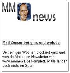 7. Zitat aus dem Artikel vom 20. Januar 2010 (der Artikel ist bei MMnews nicht mehr online): "Wer eine Mailadresse bei gmx und web.de hat, kann nicht mehr sicher sein, auch alle Mails zu erhalten. Provider blockieren Post. Seit einigen Wochen blockiert gmx und web.de Mails und Newsletter von www.mmnews.de komplett. Mails landen auch nicht im Spam. Gmx und web.de gehören zu United Internet und werden anscheinend zentral gesteuert. Nach Auskunft des Unternehmens würde MMnews auf einer Spamliste stehen."