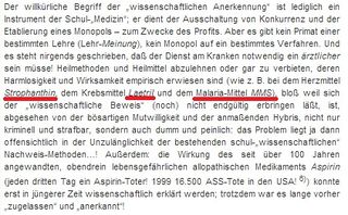 Werbender Artikel mit Falschaussagen für nicht zugelassene (Laetril), obsolete (Strophanthin) und gefährliche pseudomedizinische Mittel wie Miracle Mineral Supplement[6]