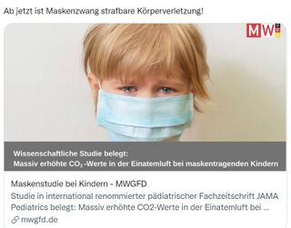 - "Wissenschaftliche Studie belegt: Massiv erhöhte CO2-Werte in der Einatemluft maskentragender Kinder".."Die Ergebnisse einer am 30.06.2021 in der international renommierten pädiatrischen Fachzeitschrift 'JAMA Pediatrics' veröffentlichten Studie mit dem Titel "Experimental Assessment of Carbon Dioxide Content in Inhaled Air With or Without Face Masks in Healthy Children- A Randomized Clinical Trial"' zeigen eindrucksvoll, dass sich schon nach wenigen Minuten des Maskentragens der Kohlendioxidgehalt der Einatemluft um durchschnittlich das 6-fache von dem erhöht, was das Umweltbundesamt als gesundheitsgefährdend einstuft.