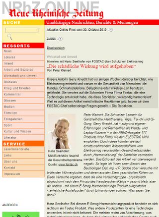 2009 veröffentlichte die Neue Rheinische Zeitung einen Artikel des Autors Peter Kleinert, der offen Werbung für Scharlatanerie Elektrosmog-Schutzprodukte der Firma Fostac macht. Vorangegangen war bereits Fostac-Werbung der Autorin Gerry Knecht. Behauptet wurde beispielsweise dass Mobilfunk das Absterben von Bäumen bewirken würde. (Bild rechts) Das beworbene wertlose Esoterikprodukt soll mit Hilfe einer "Quantenphysik" und hypothetischen "überlichtschnellen" Tachyonen funktionieren. Zur Glaubhaftmachung wird auf untaugliche, pseudowissenschaftliche Methoden und Gerätschaften wie CME, einer "Kristallisationsverfahren nach Dr. Emoto" (mit falschem Dr. Titel), Kristallanalyse nach Hagalis und die Dunkelfeldmikroskopie zurückgegriffen. Tatsächlich existiert eine Zusammenarbeit zwischen NRhZ und dem einschlägigen Verein Kompetenzinitiative zum Schutz von Mensch, Umwelt und Demokratie e. V..