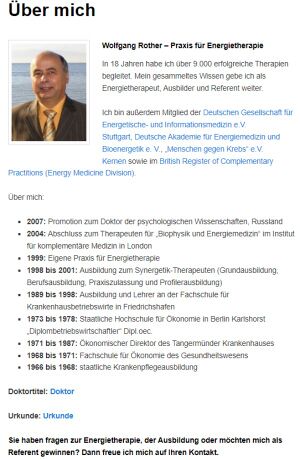 Medizinlaie Wolfgang Rother gibt auf seinen Webseiten selbst an, Patientinnen mit Brustkrebs behandelt zu haben und nennt unklar eine Zahl von 7000 behandelten Patienten. (siehe Bilder) Ohne Belege zu nennen, behauptet Rother dass 95% aller Patientinnen mit Brustkrebs, die Operationen und Chemotherapie abgelehnt hätten und sich einer von ihm favorisierten Wundertherapie Energiemedizin zuwandten, überlebt hätten.[2]