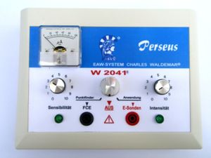 Das EAW-System (Elektro-Akupunktur Waldemar) gibt einen nicht näher beschriebenen impulsförmigen Reizstrom mit einer Frequenz von 10 Hz ab (Zitat aus der Werbung: "10 Hz sind das Gesündeste für den menschlichen Körper und selbst für Kinder verträglich"). Ein Pol des Gerätes wird mit einem Armband am Handgelenk verbunden, der andere Pol mit einer stiftförmigen Elektrode. Neben unterschiedlich geformten Stiftelektroden wird besonders der R-Energator empfohlen, eine Metallrolle mit kleinen Spitzen. Neben stationär einzusetzenden Geräten gibt es eine Taschenausführung, die nicht nur zur Elektroakupunktur, sondern zusätzlich als Zapper nach Hulda Clark benutzt werden könne. Die Methode helfe gegen "Schmerzen nahezu aller Art", weitere Anwendungen seien z.B. Asthma, "Reha nach Schlaganfällen", zu hoher und zu niedriger Blutdruck, "Stress/Burnout/Erschöpfung/CFS" und "Suchterkrankungen".[1] Bis etwa 2010 wurde als Indikation außerdem "Frigidität" genannt.
