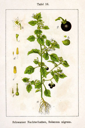 • Atropin und Scopolamin aus verschiedenen Nachtschattengewächsen wie der Schwarzen Tollkirsche (Atropa belladonna), Alraune (Mandragora officinarum), Stechapfel (Datura stramonium), Engelstrompete (Brugmansia spec.)