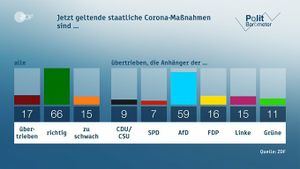 Die Gruppierung kann nur eine Minderheit der Bevölkerung repräsentieren. Die Mehrheit der Bevölkerung spricht sich in Umfragen für ausreichende oder sogar noch strengere Maßnahmen gegen die Coronavirusinfektion aus. Dies ist unter anderem an den Umfragen des ZDF Politbarometer zu erkennen. Im August 2020 sprachen sich laut Frankfurter Allgemeinen Zeitung FAZ in einer Umfrage 88% der Befragten in Deutschland zufrieden mit den Schutzmaßnahmen gegen COVID-19 aus, mit höheren Werten als in vielen anderen Ländern.[17] Das ZDF-Politbarometer nennt Ende August 2020 die Zahl von 60 Prozent der befragten Bevölkerung, die die geltenden Schutzmaßnahmen für gerade richtig hält, und 28 Prozent der Bevölkerung sprechen sich für härtere Maßnahmen aus. Nur zehn Prozent halten sie für übertrieben.[18] Eine andere Umfrage des VdTÜV (1.9.2020) ergab, dass 94 Prozent der Bundesbürger eine Pflicht zum Tragen eines Mund-Nasen-Schutzes im öffentlichen Raum befürworten. Darunter sprechen sich 59 Prozent für eine Maskenpflicht nur in bestimmten Bereichen wie öffentlichen Verkehrsmitteln, Geschäften oder Kinos aus. Und 35 Prozent sind sogar für eine Maskenpflicht im gesamten öffentlichen Raum. Dagegen lehnen nur 5 Prozent eine Maskenpflicht grundsätzlich ab.[19] Die Umfragen ergaben auch Unterschiede zwischen West- und Ostdeutschland sowie die höchsten Werte für Gegner der Schutzmaßnahmen bei AfD-Wählern. (siehe Abbildungen ZDF Politbarometer ganz unten rechts) Am 2. Oktober 2020 veröffentlichte Die Wochenzeitschrift Der Spiegel eine Umfrage, die zeigte dass 71% der Befragten die behördlichen Schutzmassnahmen für "angemessen" erachtet. 15% hielten die Massnahmen für nicht ausreichend, und 13% für "übertrieben". Auch wurde die Einstellung zur Nutzung von Masken erfragt. Die Umfrage ergab dass 85% der Befragten mit einer Verpflichtung zum Tragen einer Maske einverstanden waren. 13% sprachen sich für eine Freiwilligkeit aus, und nur 2% lehnten Masken völlig ab.[20]