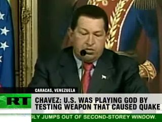 Hugo Chavez bei Russia Today am 20. Januar 2010: USA spielen Gott, testen Waffen und lösen Erdbeben aus. Den USA wird hiermit der absurde Vorwurf gemacht, das Erdbeben von Haiti im Jahre 2010 verursacht zu haben. Nach Schätzungen starben bei diesem Erdbeben zwischen 220.000 und 500.000 Menschen. (siehe: Verschwörungstheorien zum Erdbeben auf Haiti 2010)