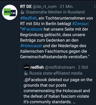 RT über Sperre von Redfish bei Facebook. Redfish wird dabei als Tochterunternehmen von RT bezeichnet