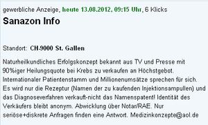 In einer im August 2012 anonym erschienenen Kleinanzeige bot eine unbekannte Person aus St. Gallen in der Schweiz Rechte zu Sanazon-Heilmitteln zum Verkauf an.[6]