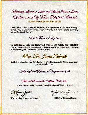 Seit 2010 lässt sich der Erfinder des Schalatanerie-Heilmittels MMS, Jim Humble als "Bishop James V. Humble" einer Scheinkirche titulieren. "Ernannt" wurde Rev. Dr. Humble von einem vermeintlichen Erzbischof Laurence (Larry) Jensen und seiner Ehefrau, der angeblichen Bischöfin Glenda Green einer "One Holy True Original Church"[1] aus Arizona, die auch unter anderen Namen wie "Spiritis Church", "Order of the Friends of Jeshua", "the Byzantine Catholic Church, Inc.", "the Liberal Catholic Church", "the Old Roman Catholic Church", "the American Orthodox Catholic Church" usw. aktiv ist.[2] Die Original Church bietet für 750 Dollar diverse Scheintitel an.[3] Behauptet wird eine 2.000 Jahre lange Nachfolgeschaft von Bischöfen. Eine Art Schisma zur römisch-katholischen Kirche wird dazu anekdotenhaft behauptet. Tatsächlich trat einer der "Vorgänger-Bischöfe", ein gewisser Bishop James Ingall Wedgwood, aus der katholischen Kirche aus. Zu nachdrücklich waren die Hinweise auf pädophile Annäherungsversuche an Jungen, so dass es zu polizeilichen Ermittlungen kam. Das gleiche geschah mit Humble-Vorgänger und Theosophen C. W. Leadbeater, der aus der "Theosophical Society" austrat, nachdem ein Pädophilie-Skandal offenbar wurde. Die Liste der Bischof-Vorgänger: [1]