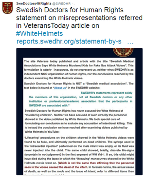 Eine Anfrage von Sputnik an die schwedische Ärzteorganisation SWEDHR unterblieb. Die journalistische Praxis mindestens zwei unabhängige Quellen zu befragen unterblieb, und den Autoren fiel die fehlende Seriosität des Veterans Today Blogs angeblich nicht auf. Veterans Today löschte inzwischen kommentarlos den Artikel, Sputnik verlinkte auf eine Archivversion. Über Facebook und Twitter dementierte die in Schweden weitgehend unbekannte Organisation "Swedish Doctors for Human Rights" SWEDHR (Leiter: Marcello Ferrada de Noli) umgehend die Behauptung von Duff. Auf den Kommentarseiten von Sputnik überschlugen sich die Kommentare in ihrer Empörung über die grausamen Weißhelme.