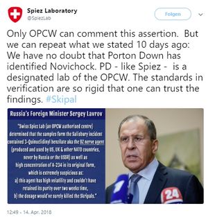 Am 14. April 2018 meldete Sputnik auf der Frontseite der eigenen Webseite: Lawrow: Skripal-Gift durch Schweizer Labor als BZ aus Nato-Arsenal identifiziert. Wörtlich hieß es: