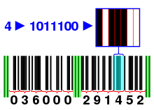Der Barcode, wie er auch genannt wird (engl. bar = Strich/Balken), besteht aus einer Aneinanderreihung senkrechter Striche bzw. Balken unterschiedlicher Breite. Im Strichcode sind eine eindeutige ID und integrierte Prüfsummen enthalten. Er kann durch so genannte Barcodeleser automatisch erkannt werden. Über eine Datenbank sind unter anderem Informationen zu Artikelbezeichnung, Preis, Artikelnummer, Herkunftsland und Hersteller zu erhalten.[5] Während Europa das EAN-Format (Abkürzung für Europäische Artikelnummerierung) verwendet, wird auf dem US-Markt das UPC-Format (Abkürzung für Universal Product Code) zur Warenauszeichnung eingesetzt. Im Handel wird eine Software angeboten, die in der Lage ist, EAN-8- oder EAN-13-Strichcodes zu erzeugen, die über einen handelsüblichen Drucker ausgedruckt werden können.