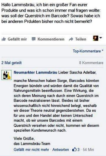 Nach Protesten distanzierte sich die Firma später von dem peinlichen Unsinn der durchgestrichenen EAN-Markierung und druckt die Markierung seit 2013 wieder ohne Querstrich.[12] Ähnlich hat Voelkel 2016 reagiert und den Querstrich wieder abgeschafft.
