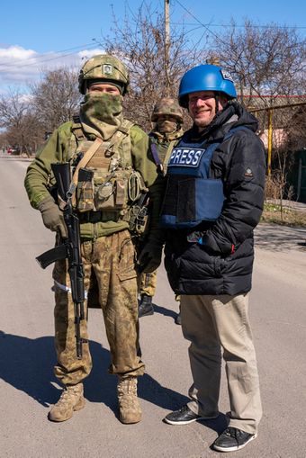 Thomas Röper als Kriegsreporter für den kremltreuen Fernsehkanal "Perwy Kanal" (Ukraine, April 2022[1])