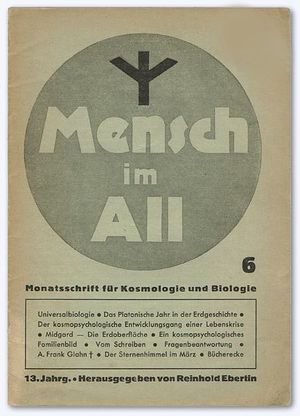 Ein davon unterschiedliches Konzept einer Universalbiologie findet sich in einem Artikel von 1941 des Autors Wolfgang-Günther Dahlenkamp (Universalbiologie) in einem Heft der Zeitschrift Mensch im All (Monatsschrift für Kosmologie und Biologie).[2] "Mensch im All" befasste sich mit Themen aus dem Bereich der so genannten Kosmobiologie, einer Weiterentwicklung der Astrologie. Herausgeber der Hefte war der Astrologe Reinhold Ebertin (1901-1988).
