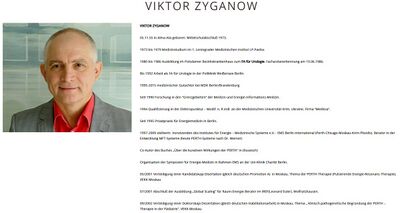 - ↑ Praxis Holistic Medicine, Prof. Dr. d. med. Wiss./RUS Viktor Zyganow, Havelländerweg 10, 14612 Falkensee