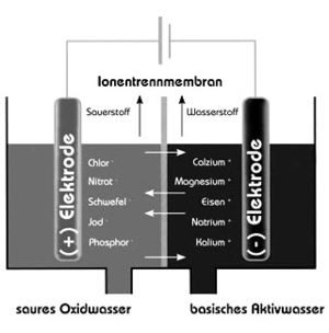 • Zwei-Kammer-Ionisierer: Wasser befindet sich drucklos in zwei Kammern, die durch eine halbdurchlässige Membran getrennt sind. In einer Kammer befindet sich die +Elektrode (Kathode), in der anderen die -Elektrode (Anode).
