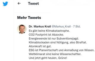 - "Die Klimakrise ist eingebildeter Schwachsinn, gesellschaftliche Hypochondrie. Ihr Sinn und Zweck ist die Einführung des Sozialismus, die Beraubung der Menschen um Hab, Gut, Freiheit und Recht. Durchschaut es, oder ihr werdet ausgezogen."