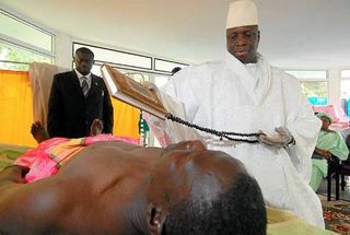 - "..Weiß gewandet von Kopf bis Fuß, stellt sich das Staatsoberhaupt vor die Kranken, murmelt Gebete und schwenkt den Koran. Dann reibt Jammeh ihnen eine grüne Pampe auf die Haut, besprenkelt sie mit einer grauen Tunke aus einer alten Evian-Flasche und gibt ihnen gelbes Zeugs zu trinken. Oral verabreichte Bananen runden das Ganze ab. Die Prozedur wiederholt der Staatsmann über Wochen hinweg und dann, sagt er, seien alle Siechen gesund..."[6]