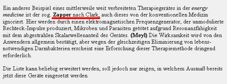 - Digetron 1000: ein Luxuszapper der Firma Medi-Gen für 7600 Euro, dessen Frequenz und Ausgangsspannung in weiten Grenzen einstellbar ist. Außerdem seien "alle ca. 350 namentlich erfaßten pathogenen Frequenzen nach Frau Dr. Hulda Clark und über 5000 Frequenzen nach Dr. Rife" "alphabetisch abrufbar".