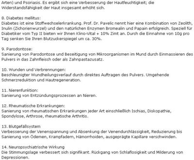 Entgegen der Gesetzgebung (LFGB) werden dem Produkt vielfältige gesundheitsrelevante Wirkungen zugeschrieben; teilweise geschieht dies auch bei Gemischen aus gemahlenem Zeolith und bestimmten Zusätzen wie Zimt oder Thymian. So sei Klino-Vital in der Lage, nicht näher bezeichnete "Schadstoffe" und "krankmachende Keime" aus dem Darm und der Leber zu binden und aus dem Körper "abzutransportieren". Auch sollen "positiv geladene" Freie Radikale neutralisiert und der Hefepilz Candida mit Klino-Vital angegangen werden können. Auch binde Klino-Vital Protonen und wirke so einer vermeintlichen Übersäuerung entgegen, wirke gegen Osteoporose und senke bei Diabetikern den Blutzuckerspiegel.