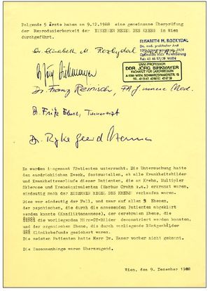 Ein 13 Zeilen umfassendes "Schreiben" ohne Briefkopf, in dem fünf Unterzeichner (darunter Hamer selbst) die Reproduzierbarkeit der „eisernen Regeln des Krebses“ an sieben Patienten gefunden haben wollen. Ein Stempel weist den Wiener Arzt Jörg Birkmayer als Unterzeichner aus. Über Methodik der Untersuchungen und exakte Ergebnisse bietet das Dokument keinerlei Informationen. Als "Verifikation" ist es daher völlig ungeeignet.[2]