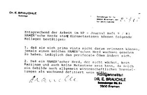 Hierbei handelt es sich um eine zehnzeilige Bestätigungsbescheinigung des Radiologen, dass diverse Kollegen niemals einen „Hamer-Herd“ haben wachsen sehen, und dass ein „Hamer-Herd“ der nicht wächst, kein bösartiger Tumor sein könne. Die Intention der Bescheinigung wird nicht klar, zudem sie sich auf „folgende Kollegen“ bezieht, diese aber gar nicht genannt werden. Als „Verifikation“ ist dies völlig ungeeignet.
