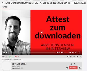 Der Urologe Jens Bengen ("Schwert der Wahrheit") aus Trendelburg bei Kassel bot pauschale Atteste gegen die Benutzung von Atemschutzmasken auf seiner Webseite zum Download an.[16] Eine 21 jährige Frau versuchte mit diesem aus dem Internet heruntergeladenen Bengen-Attest den Verzicht auf eine Schutzmaske bei der Fahrt mit der S-Bahn in München zu erklären. Einem Polizisten zeigte sie das Attest vor, war aber nicht vorher von Bengen untersucht worden. Die Frau wurde wegen Verstoßes gegen das Infektionsschutzgesetztes angezeigt. Zudem wurden Ermittlungen wegen Verstoßes gegen § 279 StGB, Gebrauch unrichtiger Gesundheitszeugnisse, gegen sie eingeleitet.[17] Das nutzlose Attest wurde unter anderem von einem Verein „Netzwerk-Demokratie“ aus Gernsbach auf seiner Homepage verbreitet. Die Staatsanwaltschaft Baden-Baden leitete ein Ermittlungsverfahren gegen den Ersten Vorsitzenden des Vereins Thomas Stenzel ein, wegen des „Verdachts des Ausstellens unrichtiger Gesundheitszeugnisse“. Anzeige wurde auch gegen Jens Bengen gestellt.[18] Im März 2021 wurde bekannt, dass das Amtsgericht München eine Mann zu einer Geldstrafe von 300 € verurteilt hatte, wegen Gebrauch unrichtiger Gesundheitszeugnisse § 279 StGB. Der Mann hatte sich ein Blanko-Attest von Jens Bengen aus dem Internet heruntergeladen. Ein Strafbefehl hatte ursprünglich eine vierfache Höhe der Strafe vorgesehen. Jens Bengen nahm sich 2021 das Leben.[19]
