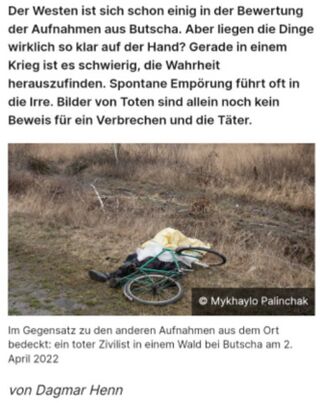 Kommentar von Dagmar Henn zum Butscha-Massaker während des russischen Überfalls auf die Ukraine (Kommentar bei twitter von April 2022)