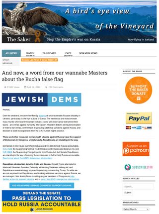Artikel der englischsprachigen Ausgabe von The Saker, in dem das Butscha-Massaker als "False Flag" bezeichnet wird und die russische Verantwortung geleugnet wird. (April 2022)
