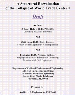 - ↑ "To all who have been following the University of Alaska Fairbanks study on thecollapse of World Trade Center Building 7:First, I would like to thank you for your interest in and support of the study. We had planned to release our findings for public review early this year. However, research often takes unexpected turns, and the more complicated theproblem, the more difficult it is to predict the completion date. We are still in theprocess of studying hypothetical collapse mechanisms and attempting tosimulate the building’s failure. Our goal is to determine, with a high degree ofconfidence, the sequence of failures that may have caused the observedcollapse and to rule out those mechanisms that could not have caused theobserved collapse. We will release our findings for public review when we are sure we fullyunderstand the mechanisms that are likely to have caused the observed collapseand those that clearly did not occur and could not have caused the observedcollapse. We expect to publish our findings later this year, but we will refrain fromnaming a completion date, given the unpredictability of the research process.Again, we thank you for your interest in our study and we appreciate yourpatience as we strive to bring a truly scientific answer to the important question ofhow WTC 7 collapsed on September 11, 2001." Dr. J. Leroy HulseyChair, Department of Civil and Environmental EngineeringUniversity of Alaska Fairbanks