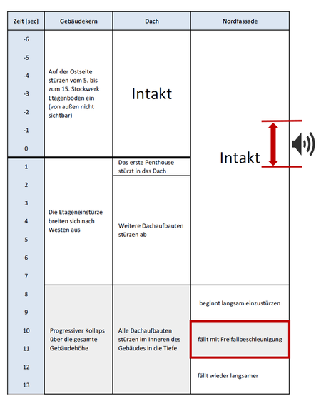 Doch zum einen haben diese Geräusche keinerlei Ähnlichkeit mit Sprengstoffexplosionen. Zum anderen zeigen Videoauswertungen zur Einordnung in den zeitlichen Gesamtablauf, dass kein Zusammenhang zur Einsturzursache bestehen kann. Das Zeitfenster dieser Geräusche (in der Tabelle rechts mit dem Lautsprechersymbol markiert) liegt in einem Bereich von neun bis etwa sechseinhalb Sekunden vor dem spektakulären Einsturz der Nordfassade, der angeblich unmittelbar von einer Sprengung ausgelöst worden sein soll.