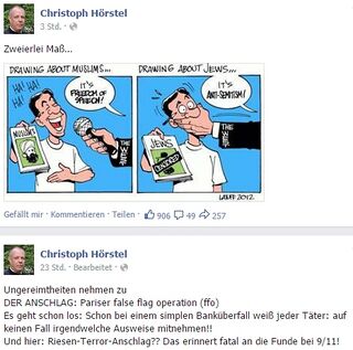 Nur wenige Stunden nach einem von Islamisten begangenen Anschlag auf die Pariser Redaktion der Satirezeitschrift "Charlie Hebdo" und einer für einige Kunden eines jüdischen Supermarkts in Paris tödlich endenden Geiselnahme veröffentlichte Hörstel bei facebook eine Verschwörungstheorie, nach der nicht Islamisten, sondern westliche Geheimdienste für beide Taten verantwortlich seien. Seine Theorie basiert unter anderem auf der Annahme, dass verchromte Rückspiegel bei entsprechendem Lichteinfall nicht hell leuchten könnten. Er zeigte bei facebook auch eine Karikatur des antisemitischen Karikaturisten Carlos Latuff. Ganz im Gegensatz zu der von Latuff getroffenen Aussage waren es nicht israelkritische, sondern islamkritische Karikaturen, die von den Tätern als Grund für die Anschläge genannt wurden. Aus gleichem Anlass und zum gleichen Zeitpunkt zeigte auch Ken Jebsen bei facebook diese Karikatur.